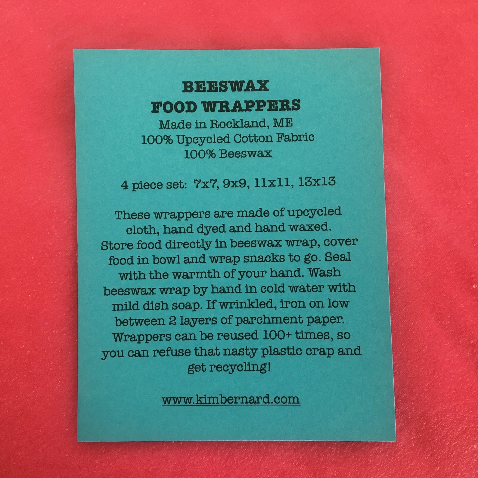 The wrappers are made of upcycled cloth, hand dyed and hand waxed. Store food directly in beeswax wrap, cover food in bowl and wrap snacks to go. Seal with the warmth of your hand. Wash beeswax wrap by hand in cold water with mild dish soap. If wrinkled, iron on low between 2 layers of parcment paper. Wrappers can be reused 100+ times.